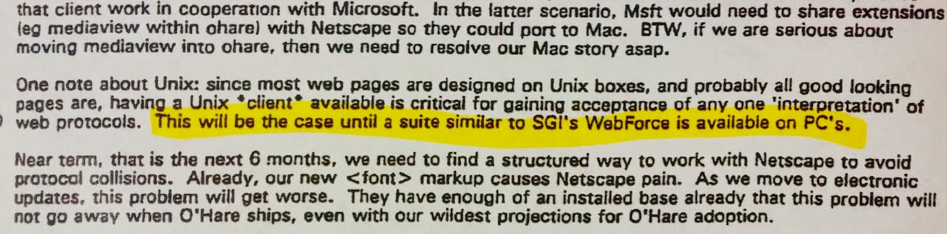 In terms of feature set, WebFORCE absolutely set the standard. Even five months later, it was referenced in a Microsoft internal exec team memo from Paul Maritz to Bill Gates, available online now because it was evidence in the U.S. Government’s anti-trust case against the company. In it, Maritz explains the gap between Unix and PCs in the web authoring space — and how it can’t be closed “until a suite similar to SGI’s WebFORCE is available on PC’s”: