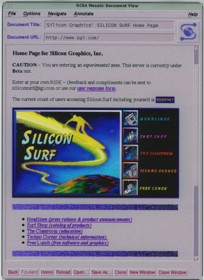 The complicating factor I was aware of was that in December 1994, SGI was already in the middle of a different OEM deal with Netscape. You see, our customer support team had more fully embraced the web than any other computer company at the time (and, arguably, more than any other company period), having launched a customer-facing portal called “Silicon Surf” in March of that year. Believe it or not, you can still interact with a live version of Silicon Surf from that period, thanks to the work of Daniel Rich, SGI’s “webmaster” back in ’94, who resurrected the site many years later from a promotional CD-ROM. (Yes, back then it actually made sense to distribute a website on a disk in order to get people excited to go online!)