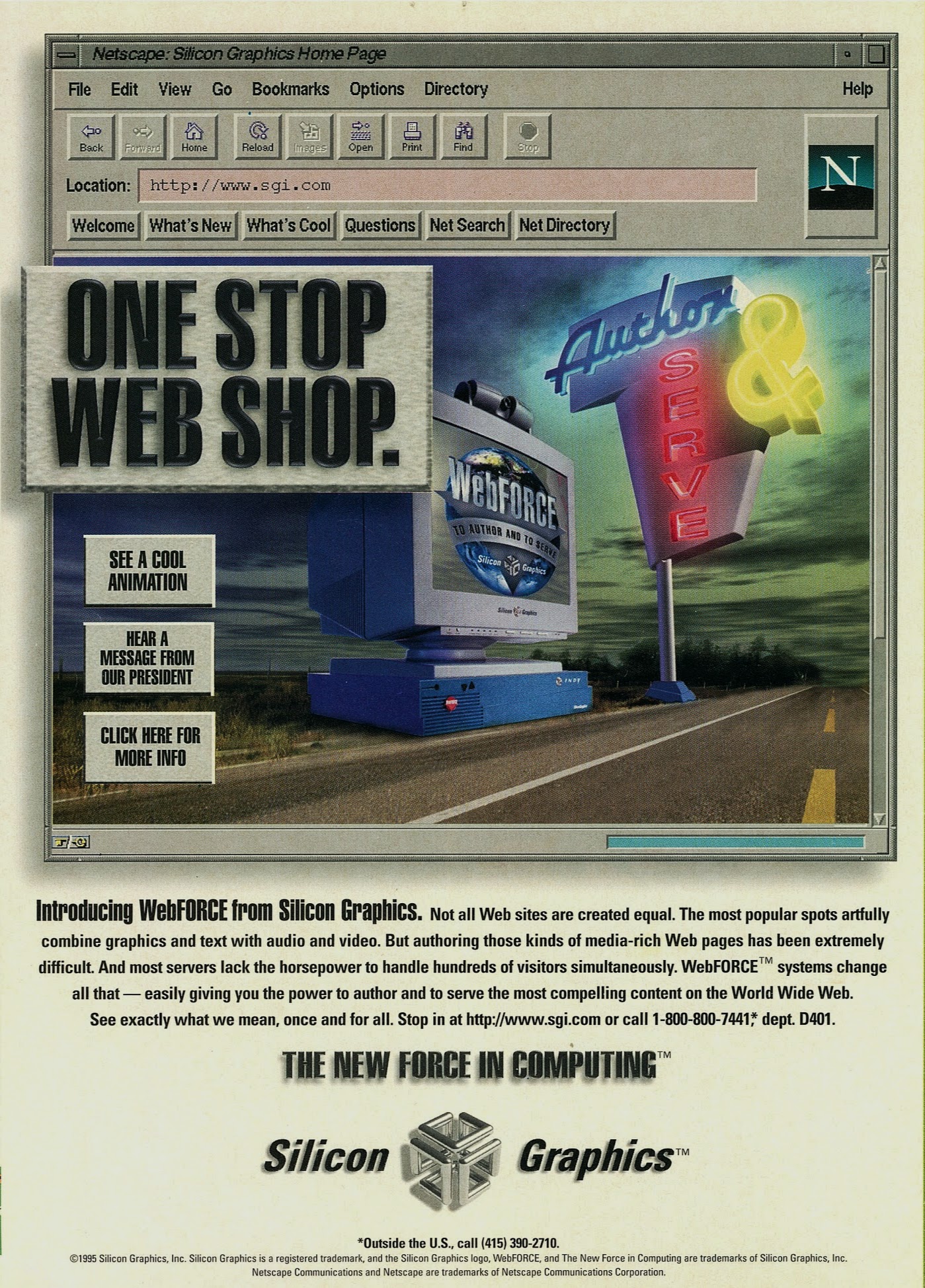 The team at Poppe Tyson, SGI’s ad agency of record, who had already blown me away by creating a killer logo for WebFORCE, did it again with what may be the very first print ads for any web product. The flagship ad, that ran for many months in publications like Wired, ComputerWorld, and since forgotten places like Interactive Age and Interactive Week, still looks great to me: